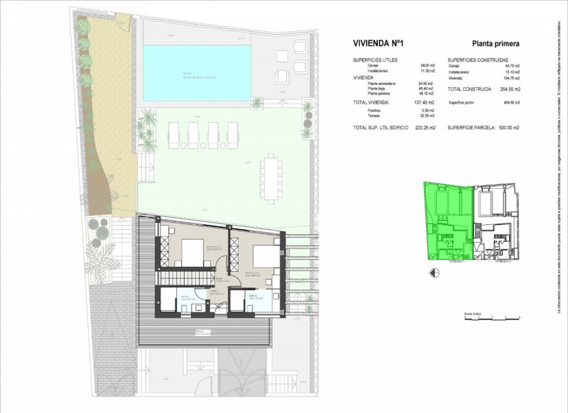 La villa dispose également de 430 m2 de jardin entièrement aménagé, d'une piscine privée chauffée de 9 x 4 mètres avec vue imprenable, avec couverture enroulable.